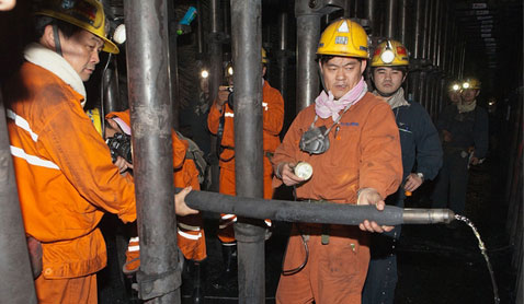 煤層注水是指在開采之前利用鉆孔向煤層注入壓力水。預先濕潤煤體,可以降低煤塵生成量。將水均勻地注入煤體,其水分達4%以上,可以防止突出發(fā)生。水改變了煤的力學性質(zhì),使應力分布均勻化,彈性能釋放速度變小,功率降低,沼氣排放速度降低,比初放時可降低90%。